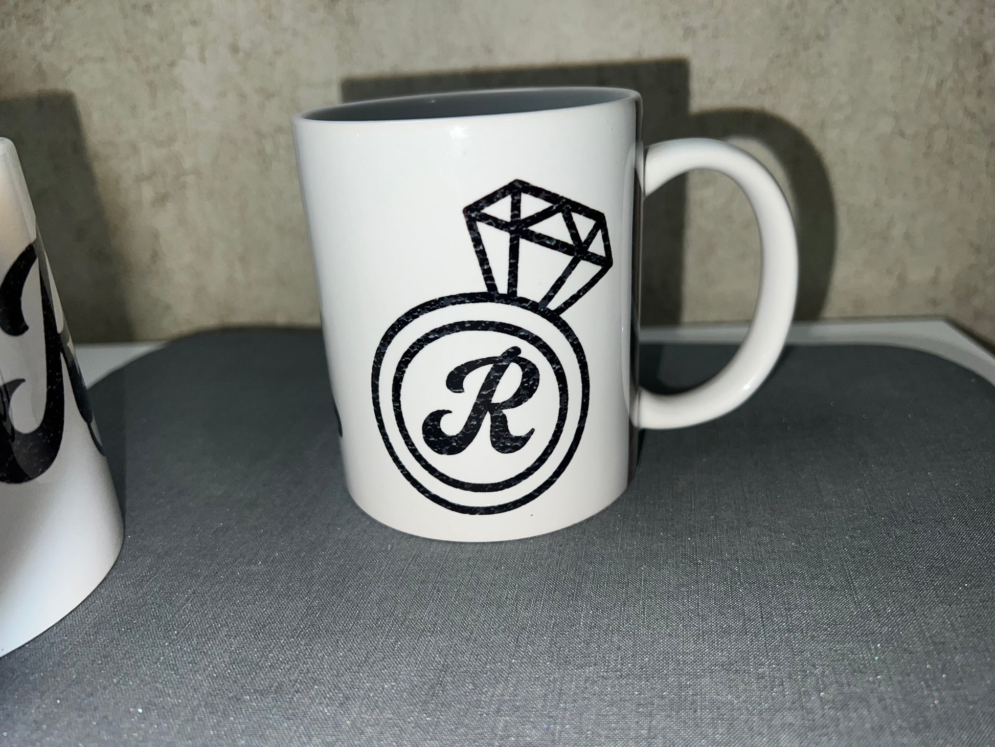 The Groom Mug has two solid rings, and the bride mug has a Dimond ring